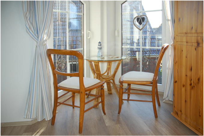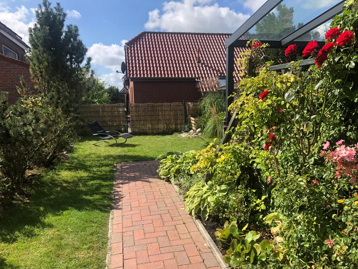 Die Terrasse mit Gartentisch bietet Sitzmöglichkeiten für 4 Personen.